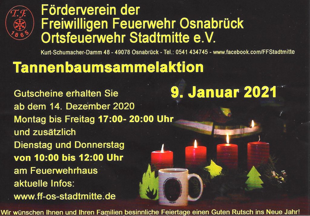 In der Tagespresse war zu lesen, dass die Freiwilligen Feuerwehren in Osnabrück in diesem Jahr keine Bäume einsammeln werden. Wir fragten beim Förderverein der Freiwilligen Feuerwehr OS-Stadtmitte nach und erhielten die Auskunft, dass der Verein in dieser Saison die Sammelaktion übernimmt. Sie können wie gewohnt ab dem 14. Dezember 2020 von Montag bis Freitag 17 Uhr bis 20 Uhr und zusätzlich Dienstag und Donnerstag von 10 bis 12 Uhr Ihre Spende im Feuerwehrhaus am Kurt-Schumacher-Damm 48 abgeben und Ihren Baum mit dem Spendengutschein am 9. Januar an den Straßenrand legen.